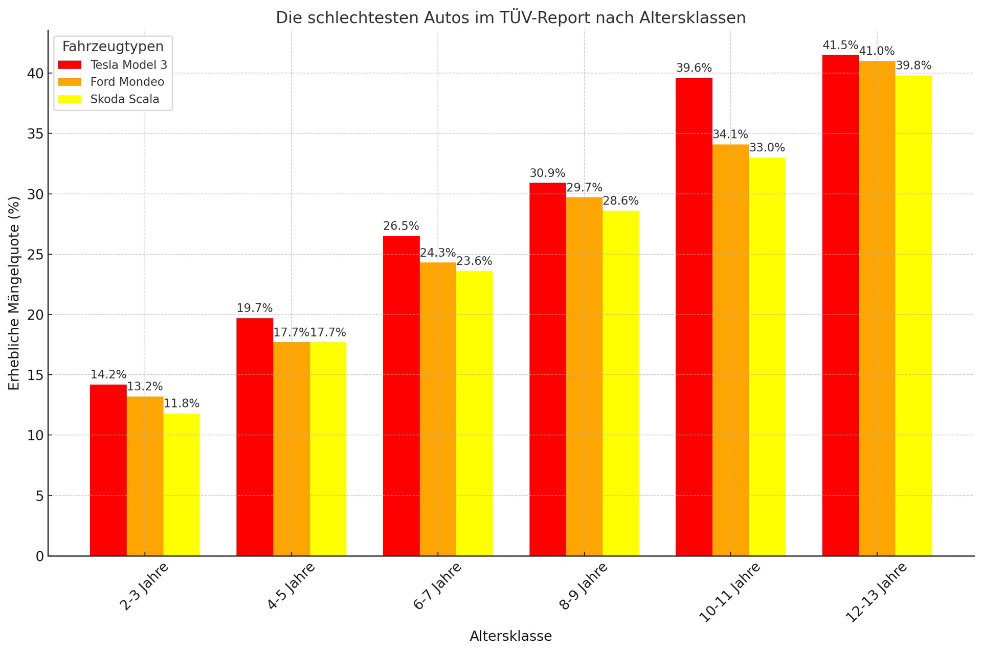 Die Statistik von TÜV-Report 2025 zeigt, welche Fahrzeuge in unterschiedlichen Altersklassen die höchsten Mängelquoten aufweisen. Auffällig ist, dass Modelle von Dacia und Renault in älteren Fahrzeugklassen konstant hohe Werte erreichen, während das Tesla Model 3 insbesondere bei jüngeren Fahrzeugen negativ auffällt. [caption id="attachment_117090" align="alignnone" width="1024"]