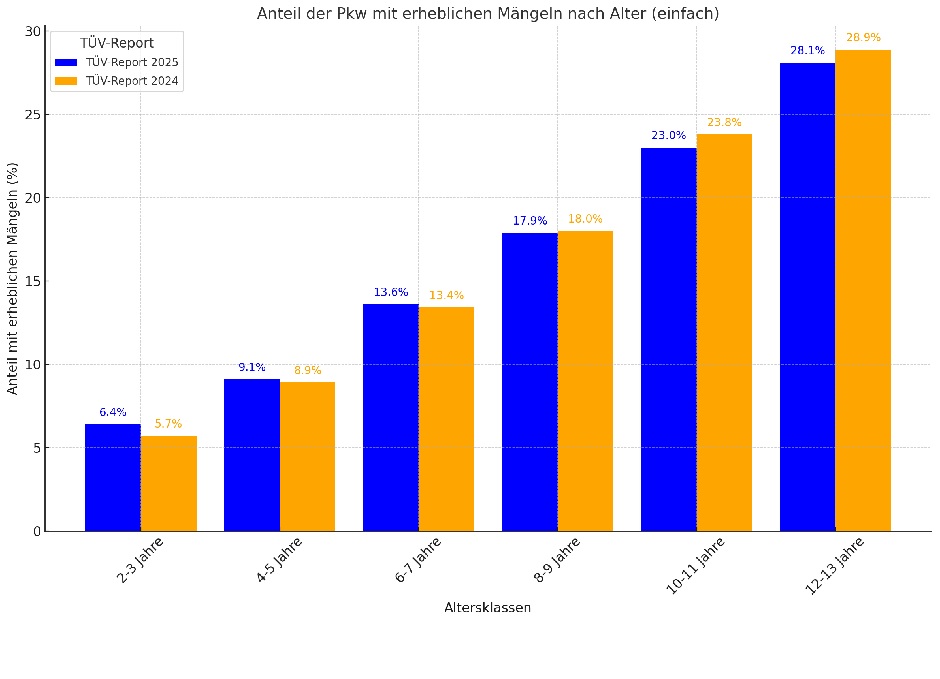 Hier finden Sie einen Vergleich der Anteile von Pkw mit erheblichen Mängeln nach Altersklassen aus dem TÜV-Report 2025 und dem Vorjahr.